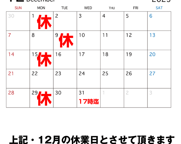 2025年 12月 休業日のお知らせ